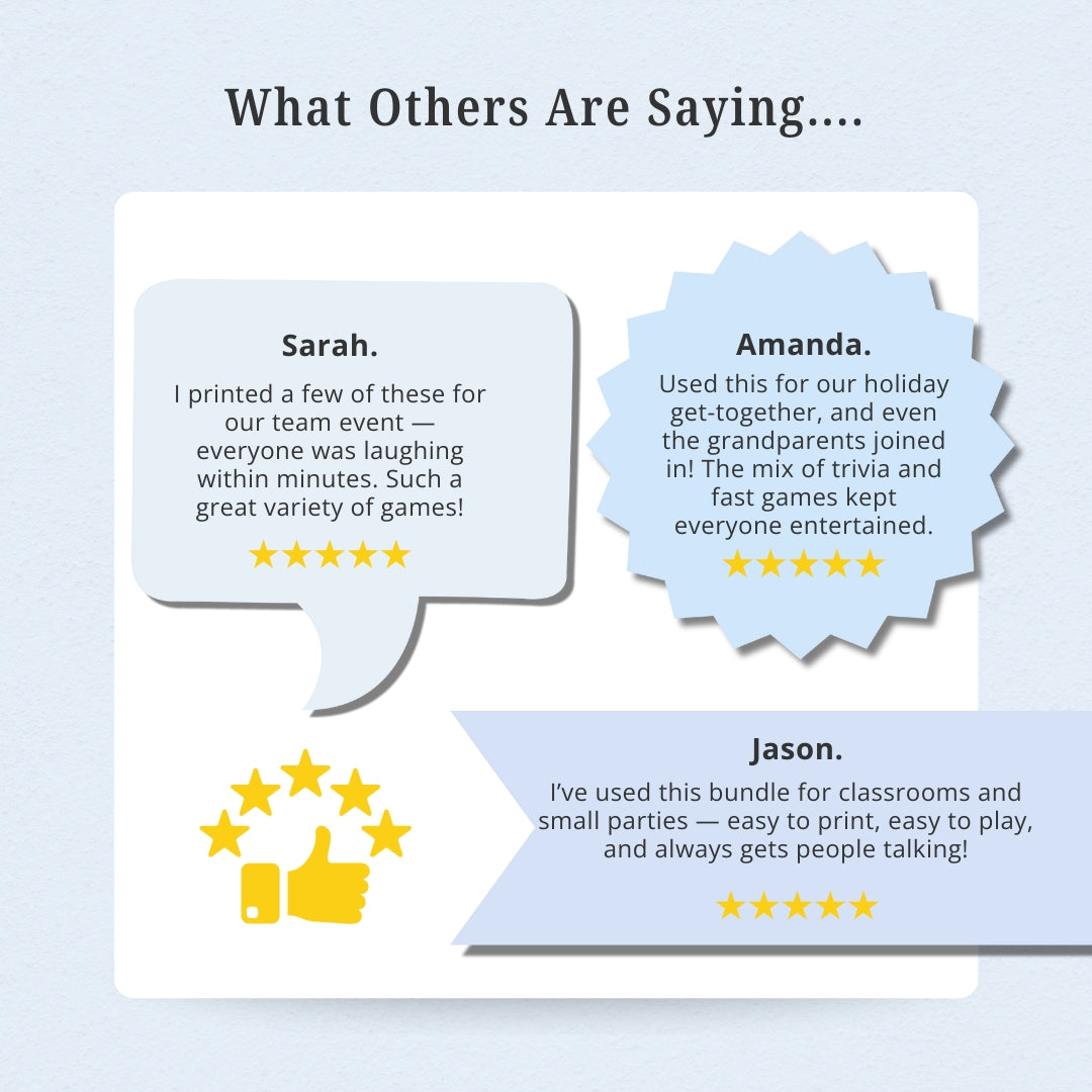 Bring instant laughter, ease the awkwardness, and spark real connection—whether it’s a party, classroom, or team event. These fast, flexible games are simple to set up and guaranteed to get people smiling, mingling, and having fun.