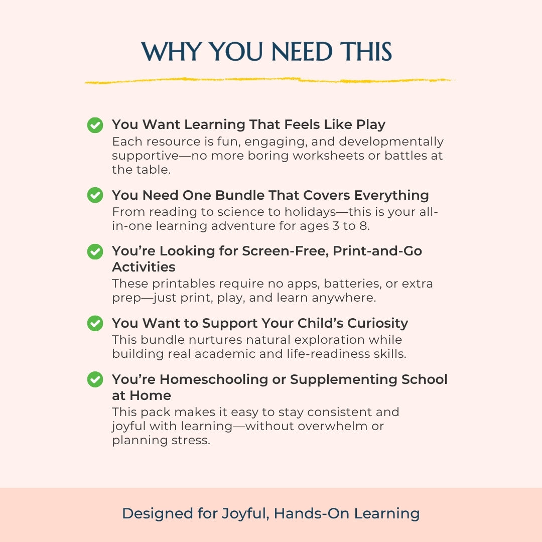 Give your child the gift of joyful learning! This all-in-one bundle includes over 520+ pages of fun, screen-free educational activities—perfect for building early reading, fine motor development, and a love of science and discovery. Whether you're homeschooling or enriching learning at home, this toolkit makes growth simple and playful.