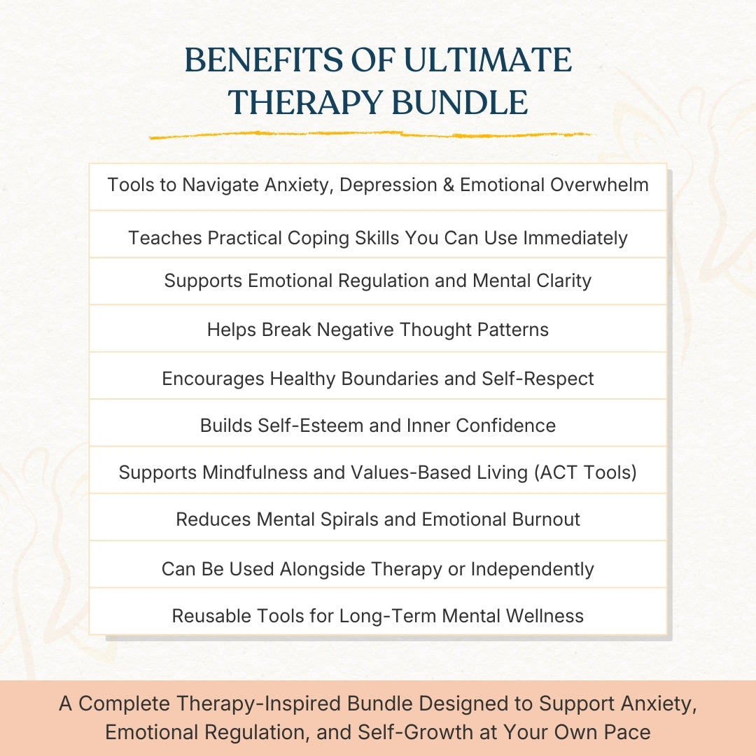 The Ultimate Therapy Bundle is designed to cater to a wide range of mental health needs, making it suitable for individuals of all ages and backgrounds. From anxiety and depression to addressing cognitive distortions, the inner critic, self-esteem issues, and practicing self-care, this bundle includes a variety of resources to help you effectively manage your mental health.